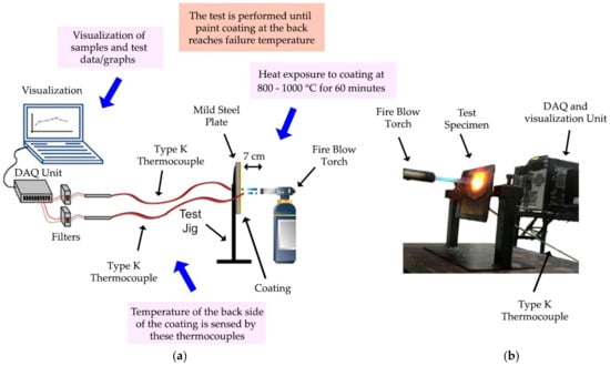 To evaluate the coating performance, samples were observed and characterized through two different fire tests. The fire resistance test was performed to evaluate the coating char thickness and the furnace test was performed to study the expansion rate of the char layer formation. The fire resistance test was performed until the backside of the paint coating reached failure temperature. The fire resistance testing was designated using a thermo-couple that acted as a temperature sensor to check the temperature at the backside of the coating samples. The test is carried out by using two Type-K thermocouples connected to Agilent 34970A data acquisition (DAQ) sensor (Agilent, Santa Clara, CA, United States). The thermocouples are attached at the backside of the steel plate coated with fire retardant coating (to measure the heat on the backside) and at the front of the surface of the coating (to measure the initial temperature produced by the fire blow-torch). The coatings are exposed to heat at the temperature of 800 to 1000 °C for 60 min, which complies with BS 9999: 2017 Code of practice for fire safety in the design, management, and use of buildings (BSI, 2017). The test produced time/temperature graphs and the visual effects for all samples. The illustration and actual setup of the fire resistance test is shown in Figure 4.