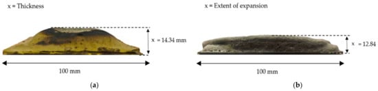 The measurement of the coating char thickness was obtained from the fire resistance test, while the expansion rate of the coating char layer was obtained by a furnace test, which was carried out to examine the expansion rate of the coating char layer. Three samples were tested for each testing to obtain the average value. These samples then underwent EDX analysis for the anti-oxidant properties of intumescent coating. The difference between the furnace test and fire resistance test is the heat direction exposed to the coating samples. The fire resistance test is done by using a blowtorch flame, as discussed in the previous paragraph. Heat is only applied to the front side of the coating samples, while in the furnace test, samples were heated uniformly from all directions, which increased the heat and mass transfer of the coating. The temperature was kept constant at 50 °C for 15 min and then was raised to 800 °C for 30 min of dwell time to expose heat to the samples completely. Subsequently, the sample was cooled for about 30 min to prevent the samples from cracking. The char coating thickness and the extent of expansion measurement for the coating sample is shown in Figure 5.