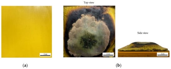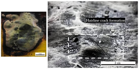 Furthermore, the hairline crack formation was observed on the S1 coating sample surface, which prevents the coating from fully expanding for protecting the steel substrate, as shown in Figure 10. S1 coating was unable to withstand the rapid temperature increase in the fire resistance test and experienced significant mass transfer out from the char, which increased the heat, and transferred it into the metal surface. According to Wang et al. (2020) [], the increased amount of SiO2 content produced a denser and a lesser pore residual char which enhanced the strength of the char layer once exposed to heat. Thus, this condition resulted in a more compact and harder char layer. A similar study by Mohd Basri et al. (2021) also revealed that lower silica content in RHA-based geopolymer leads to fewer pores for char layer expansion [].