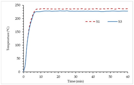 Plotted graph of the temperature versus time for sample S1 and S3 is shown in Figure 8. From the graph, the result indicated that the silica in both samples S1 and S3 contributed to the formation of the char layer which affected the equilibrium temperature. The GB composition for both coatings resulted in a similar inclination for TT200 after eight minutes of the fire resistance test. This was due to the rate of char formation for both samples being influenced by the GB composition of the coatings. The effect of silica content can be observed at 223 °C as sample S3 is able to retain its TAE while sample S1 TAE continues to rise until 236 °C before it starts to retain its TAE. Mohd Basri et al. (2021) revealed that once exposed to fire, a lower silica content RHA-based geopolymer resulted in a weaker char strength due to the amount of water content evaporated, and generated pressure in the pores of the material and microvoids, which causes the coating to crack []. In the fire resistance test, it was observed that sample S1’s coating was unable to withstand the rapid temperature increase and experienced significant mass transfer out from the char, which resulted in higher TAE due to weaker char layer strength. Sample S3 showed 5.83% improvement in TAE compared to S1. While for TT200 analysis, sample S3 and S1 recorded 316 s and 305 s, respectively, to reach 200 °C. For TT200, sample S3 showed 3.48% improvement when compared to S1. It was also observed that the main difference between samples S1 and S3 were the char layer thickness and compactness. The result is in good agreement with the study by Beh et al. (2019), which showed that the char layer’s thickness influenced the coating’s fire safety efficiency []. The correlation between the char layer’s thickness and the equilibrium temperature will be further discussed in the coating characterization comparison.