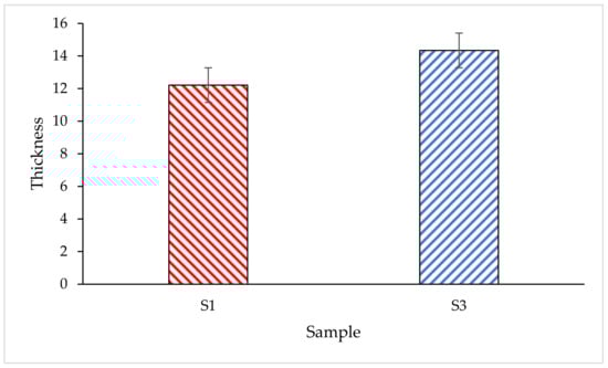 The thickness of the char layer after the fire resistance test is shown in Figure 9. It was observed that the char formation thickness for S3 is 14.34 mm and it is 12.21 mm for S1. An improvement of 2.13 mm char formation thickness was observed with a difference of 3.61% in TT200 response and 1.83% in TAE response when S3 is compared to S1. The thickness of the intumescent char layer affected the fire protection performance of the coating, and a correlation between the thickness of the char layer and the equilibrium temperature was noted. This is in agreement with the research by Pimenta et al. (2016) [], therefore it can be concluded that the volume of intumescence formed is the determining factor for thermal insulation. The coating’s performances decreased in the same order as the intumescence thickness decreased.