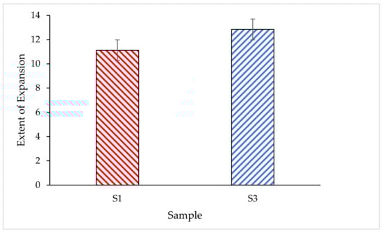 Figure 11 shows the graph of the extent of expansion of coating for both S1 and S3 coating samples. It was observed that the expansion of char for S1 was 11.12(×) and for S3 it was 12.84(×). The expansion of char observed was almost the same as the formulation for both coatings, which was similar to a 48.625% addition of RHA-based GB. Thus, it was found that the presence of RHA-based GB contributed to the effect of high swelling capacity which provided good protection to the substrate.