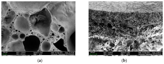 However, the fire protection performance of the intumescent coating did not only depend on the thickness of the char layer formed. The microstructure characteristic of the char layer formed also plays an important factor in minimizing heat penetration. According to Yew et al. (2014) [], bigger pores on the coating surface encouraged a higher penetration of heat to reach the steel, which increased the temperature rise of the surface below the char layer. In addition, the pore sizes allowed oxygen to be diffused through the combustion reaction between the surface of the steel and the surface below the layer of char. The reaction between the heat and the char layer intensified and increased the char layer’s mass loss, which eventually caused the coating to fail and fall off from the substrate. The differences between these two char layers can be seen in Figure 12. As observed, the surface for sample S1 contained bigger pores and was less dense compared to S3. The dense foam structure on the sample S3 created a stable char layer, which led to the reduction of the heat from penetrating the steel plate substrate. This finding was supported by the result from the fire resistance, in which sample S3’s thermal performance improved by 3.61% for TAE and 1.83% for TT200 compared to sample S1.