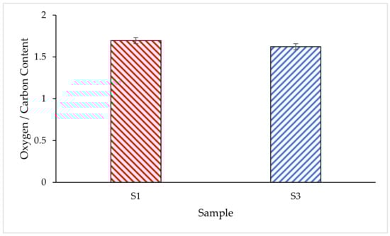 After the furnace test, the char layers formed by the coatings were sent for EDX analysis. Results obtained from the EDX analysis showed that sample S1 char contains 29.65% carbon (C) and 50.26% oxygen (O), while sample S3 contains 30.79% carbon (C) and 49.96% oxygen (O). Figure 14 shows the oxygen/carbon ratio in the char layers formed by S1 and S3 samples. Based on the result obtained in Figure 14, the oxygen-to-carbon ratio of S1 and S3 coating samples was 1.695 and 1.622, respectively. The result showed that the lower oxygen–to-carbon ratio of S3 coating was obtained over the S1 sample coating, which indicated that the S3 sample coating has better anti-oxidant properties. By referring to the result obtained in the fire resistance and furnace tests, the S3 sample coating showed better fire protection performance, and this matched with the result obtained from EDX analysis.