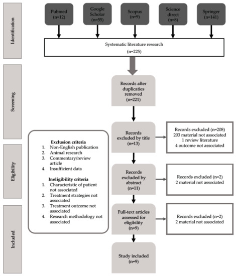 After removing duplicates with EndNote, 221 results remained, which were then filtered based on their titles and abstracts. As a result, the remaining 11 articles were inspected on a full-text scale, and two articles were eliminated since they did not meet the eligibility qualification. Finally, nine articles were selected as they met the requirements (Figure 1).