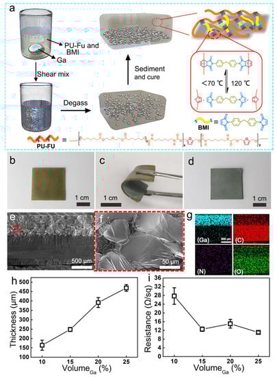 Fabrication and characterization of bilayer-structured Ga–PU composites. (a) Schematic illustration of the fabrication procedure of the composites, together with a schematic depiction of the elastomer structure and the mechanism of the formation and dissolution of the dynamic DA bonds. (b–d) Optical photographs of the as-fabricated Ga–PU composite (15 vol% Ga): (b) elastomer-rich layer, (c) flexibility of the composite, and (d) Ga-rich layer. (e–f) SEM micrographs and (g) EDS mapping of the cross-section of one representative composite (25 vol% Ga); the upper area is the Ga-rich phase of the composite. (h) Thickness of the Ga-rich layer and (i) sheet resistance of the Ga–PU composites dependent on the vol% of Ga.