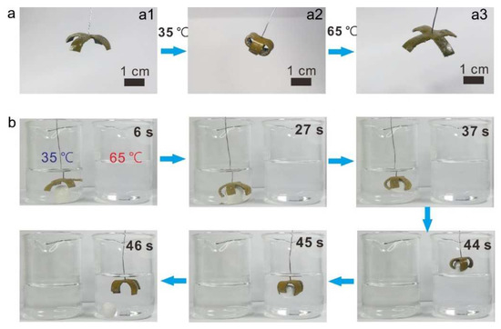Based on the composite’s excellent shape-morphing performance and dual-shape memory abilities, a four-fingered gripper is designed and constructed using the LM–PU composites (Figure 3a). To make this gripper work, a shape programming process is performed. Specifically, the gripper, which is initially in an open state (Figure 3(a1)), is folded into a clenched state (Figure 3(a2)) as the first temporary shape. Subsequently, the gripper shape is fixed by the crystallization of PCL segments at −10 °C. The clenched gripper is forced to open again to form the second temporary shape (Figure 3(a3)), which is fixed by the solidification of Ga microdroplets at −35 °C. As proof of concept, the pre-programmed gripper is employed to move an object from one beaker to another (Figure 3b and Video S2). When the gripper reaches into the first beaker filled with 35 °C water, which melts the solidified Ga microparticles, the gripper gradually recovers its clenched state and tightly grasps the ball. Subsequently, the gripper takes the ball out of the first beaker and moves it to the second beaker, which is filled with 65 °C water. The PCL crystalline regions melt in such an environment, and the gripper returns to the original shape, releasing the ball in the process.
