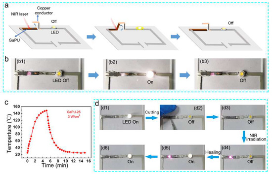 Light-controlled and self-healing LED circuits enabled by Ga–PU composites. (a) Schematic illustrations showing a light-controlled switch made of the composite for an electric circuit. (b) An LED circuit is remotely controlled by the composite switch (20 vol% Ga) under NIR light irradiation. (c) The temperature as a function of time for the composite with 25 vol% Ga under NIR irradiation (3 W/cm2). (d) Photographs demonstrating the self-healing LED circuit with the composite (25 vol% Ga) as conductor; the composite is severed by a knife and healed by irradiating the break with NIR light.