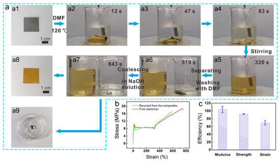 In addition to self-healing performance, the DA bond-based network also endows the Ga–PU composites with recyclability. Notably, unlike other dynamic covalent bonds, such as dynamic ester bonds, which require a catalyst to trigger bond dissociation [61,62], DA bonds dissociate completely into furan groups and imide groups at a high temperature (ca. 120 °C). Therefore, the DA bond crosslinked polymer can be fully dissolved in solvents upon heating [46,63]. This chemical nature of DA bonds enables the separation of the Ga microdroplets and the PU elastomer. The separated Ga microdroplets are easily recycled because of their high interfacial tension in acidic or alkaline environments [64]. Accordingly, both the Ga and polymer matrix from the Ga–PU composites can be recycled, which is an important improvement compared to other electric fillers-based (e.g., carbon nanotubes [65]) composite systems, some of which are very challenging to be recycled. As shown in Figure 6a and Video S5, a Ga–PU composite film is immersed into DMF and heated to 120 °C. By stirring for 320 s, the PU elastomer component of the composite is completely dissolved, allowing the residual Ga microdroplets to precipitate at the bottom of the beaker. After washing with DMF several times, the Ga residue is treated with a base (i.e., 0.6 M NaOH aqueous solution). The oxide layer of Ga microdroplets is quickly removed, which significantly increases the interfacial tension of the Ga/base solution and provides the driving force for the Ga droplets to merge into a large LM droplet (reducing the surface area of Ga) [10,66,67]. Finally, a macroscopic Ga droplet is obtained, which can be reused readily. In this experiment, the recycling efficiency is as high as 96.7%, which is comparable to the result (~96%) obtained in a previous report where liquid metal is filled into polymer microchannels [64]. Moreover, the PU prepolymer can also be obtained by removing the DMF, and reprocessing by heating in the oven at 70 °C for 48 h, during which the prepolymer is crosslinked again via the DA reaction between the Fu groups and BMI. The recycled PU elastomer exhibits similar mechanical properties to those of the pristine elastomer (Figure 6b,c).