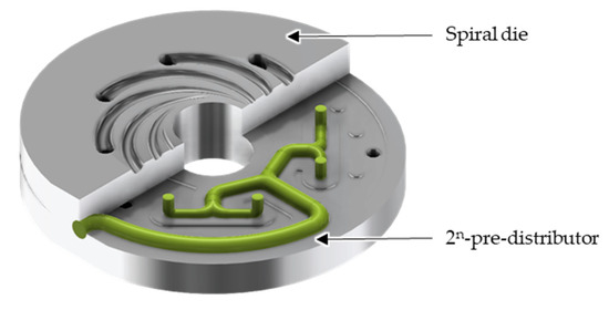 - Zatloukal, M.; Tzoganakis, C.; Perdikoulias, J.; Saha, P. Numerical simulations of polymer flow in flat spiral dies. Polym. Eng. Sci. 2001, 41, 1683–1694. [Google Scholar] [CrossRef]
