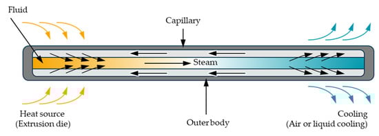 Heat pipes are already used in many areas such as electronics cooling and aerospace [23,24,25]. They consist of a closed outer body, usually cylindrical in shape, with a capillary structure on the inner walls and are partially filled with a fluid [25,26]. This structure is shown in Figure 2.