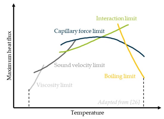 Rtot is the total thermal resistance, including the radial resistance between external heat source and evaporator wall and the axial resistance of the steam flow. The heat pipe performance or heat flux density is restricted by several physical boundaries shown in Figure 3 [26]: