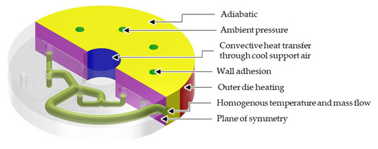 In accordance with common practice, a steady state with laminar, perfectly wall-adherent and incompressible flow is considered. Moreover, a homogeneous temperature and velocity at the die inlet are assumed (Figure 4) [5,20,21].