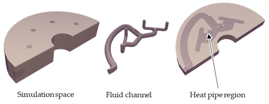 To discretise the pre-distribution geometry, the mesh generator snappyHexMesh is used, which performs a representation of the complete computational domain by hexahedron-shaped control volumes. All elements are first assigned a very high-flow resistance. For this purpose, according to Khadra et al., at the moment the conservation equation is extended with a term in which a proportionality factor for the velocity vector is integrated. The proportionality factor represents the inverse Darcy coefficient, i.e., the permeability of the material [30]. If this value is very high, the flow of the fluid through this geometry volume is suppressed, representing the steel body. The flow channels are then taken into account by means of an adjustment of the local flow resistances. In this process, the flow resistance is reduced in all elements of the die grid that are located within the flow channel geometry. Although a coarser partitioning is sufficient outside the flow channel, since only the heat conduction is calculated, the mesh in the flow channel is refined to represent flow effects sufficiently accurately. Mesh independence checks have shown that a one-level refinement is sufficient. Furthermore, areas where an integration of heat pipes would potentially be useful are refined. For reasons of symmetry, it is sufficient to perform the calculations for only one half of the mould. This results in a mesh with 620,141 volumes, which is shown in Figure 5 and leads to a computation time of about 3.5 h.