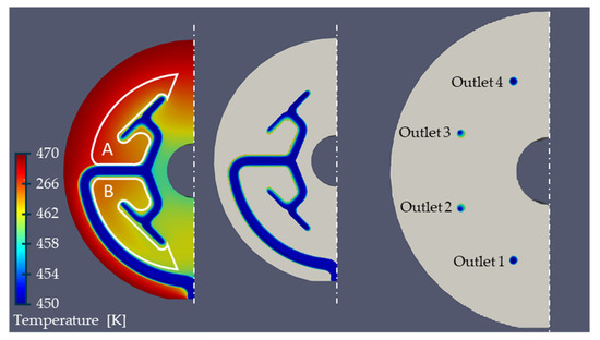 In order to determine the temperature distribution without thermal homogenisation, a first basic simulation is performed without heat pipes. According to Yesildag, the temperature and throughput variation between the outlets increases as the difference between the melt and die temperature increases. Moreover, the shear heating effect is affected by the total mass throughput. A homogeneous inlet mass flow of 100 kg/h with a constant melt temperature of 453.15 K and an outer die temperature of 473.15 K is assumed, which is in the range of realistic processing temperatures [35]. The temperature of the cool air in the centre of the die is assumed 293.15 K; this causes a heat transfer coefficient of 18 W/(m2*K) [5]. Since the top and bottom of the die are in contact with other heated components of the extrusion line, e.g., the spiral die, it can be assumed that the heat loss is comparatively low. Therefore, the top and bottom are considered adiabatic. Figure 6 shows the resulting temperature distribution both in the die and at the outlets. The outlets are numbered from 1 to 4. It becomes clear that the temperature in the outlet is not homogeneous. In addition, the temperature at outlets 1 and 4 seems to be lower than at outlets 2 and 3, which is in good agreement with the work of Yesildag and Hopmann and shows that the immersed boundary approach works [5,20,21].