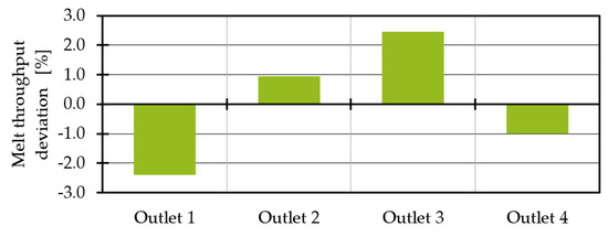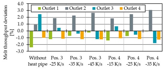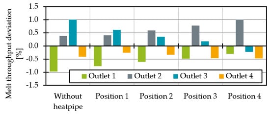 Finally, the temperature changes will influence the melt throughput distribution. Therefore, the mass throughput deviations with dependence on the heat pipe positions are shown in Figure 12. For a perfectly homogenous distribution, the deviation should be 0% at all outlets. It is obvious that as the influence of the heat pipe on the melt channels increase, the throughput at outlet 3 decreases. This was to be expected since the temperature and thus the shear viscosity drop. Since the viscosity describes the flow resistance, throughput decreases at lower viscosities or higher flow resistances. However, the heat pipe influence at position 4 is so great that the system is overcompensating. The mass flow deviation at outlet 3 drops into the negative.