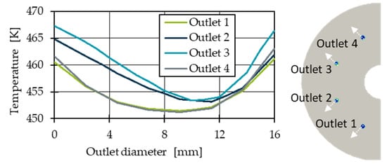 The analysis of the simulation results with a heat pipe at position 4 shows again the larger heat flux surface at this heat pipe position. The melt flows are increasing and decreasing more strongly, but the same effects tend to be observed. With a cooling rate of −35 K/s, it is possible to equalise the average temperatures in outlets 2 and 3. To achieve similar average temperatures at heat pipe position 3, the cooling rate was raised to −45 K/s (79.9 W). The remaining temperature difference between outlet 2 and 3 is 0.2 K. In addition to mass flow redistribution, the decreasing average temperatures at outlet 3 result in increasing thermal homogeneity (Figure 15). The heat pipes at position 3 seem to result in a more homogeneous temperature distribution at all outlets compared to position 4.