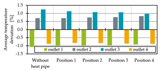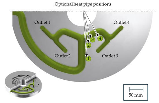 To homogenise the temperature and the mass throughput, the third outlet was cooled. Therefore, four different heat pipe positions are investigated, which are shown in Figure 9. In each simulation, one heat pipe with a radius of 3 mm and a length of 30 mm was integrated. Since the pre-distributor is an interacting system where the effect on one outlet leads to deviations at all other outlets, the efficiency of the heat pipes and the average of the temperature deviation across all four outlets (Equation (11)) were compared. The resulting average temperature deviations for a cooling rate of −25 K/s, which corresponds to a heat transfer capacity of 44 W, are shown in Figure 10. According to a manufacturer’s data sheet, a heat pipe with a diameter of 6 mm and a length of 100 mm can reach up to 137 W [36].