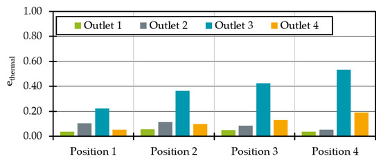 As the temperature distribution is not homogeneous over the outlet surface (Figure 6 and Figure 8), ethermal was used to evaluate the thermal homogenisation at all outlet’s cross sections. The indicator ethermal is often used to evaluate mixing devices and allows a comparison of the temperature distribution in one cross section compared to the temperature distribution in another cross section [37,38]. The calculation of ethermal is given in Equations (12) and (13), where σ describes the thermal homogeneity at the outlet without heat pipe influence and the outlet with heat pipe influence with A = total area, Ai = cell area, υi = cell temperature, = average temperature in the outlet plane.