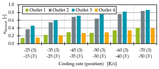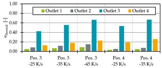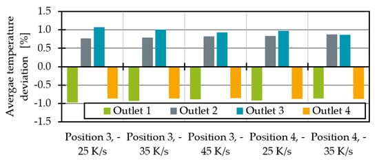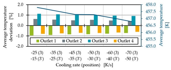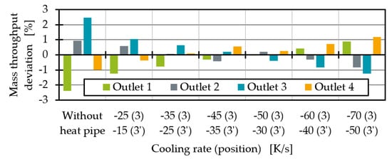 As shown in Figure 18, thermal homogenisation is improving for all outlets when increasing the cooling rates. Moreover, higher cooling rate differences between position 3 and 3′ seem to result in more homogenous temperatures at all outlets. The most homogenous process point is reached with a cooling rate of −70 K/s at position 3 and −50 K/s at position 3′. The mass flow deviation (Figure 19) shows that the mass flow distribution is significantly improved by the heat extraction of the two heat pipes at position 3 and 3′ compared to the state without heat pipes. The mass flow deviation for all test points with two heat pipes is less than 1%. Compared to one heat pipe (Figure 14), the mass flow distribution is no longer overcompensated and significantly improved. Especially at cooling rates of −45 K/s at position 3 and −35 K/s at position 3′, to then −50 K/s at position 3 and −30 K/s at position 3′, respectively, the mass flow distribution is excellent. At higher cooling rates, the throughput deviation becomes worse again for the process point investigated but is still acceptable compared to the distribution without heat pipes.