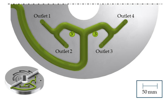 As the output at position 2 represents a new, excessively high mass flow, the integration of another heat pipe could be helpful to homogenise the temperature and mass flow distribution. Therefore, the integration of another heat pipe is tested by integrating two heat pipes symmetrically, as shown in Figure 16. To cool down the temperature at outlets 2 and 3, and since the average temperature at outlet 3 is higher than at outlet 2 (Figure 6), the cooling rates of the heat pipes at position 3′ are set lower than at position 3. The difference between the two positions is 10 K/s and 20 K/s, respectively. Maximum cooling rates of up to −70 K/s are simulated, with all cooling rates listed in Table 3. The extrusion operating point remains the same.