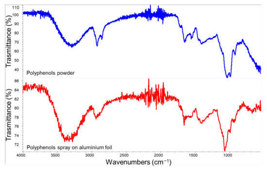 In Figure 3, the FTIR spectrum of the polyphenol powder was compared with the one obtained from the sprayed polyphenols solution on an aluminium foil. This comparison evidenced a correspondence between main bands except for the band appearing at 990 cm−1, which was attributed to the C-O-C vibrational modes of carbohydrates and organic acids derived from tomato [76]. This difference can be ascribed to the different surface composition detected by ATR-FTIR in the case of the powder or spray suspension. In the latter case, electrolytic substances are reasonably more concentrated on the surface than in the case of the powder.