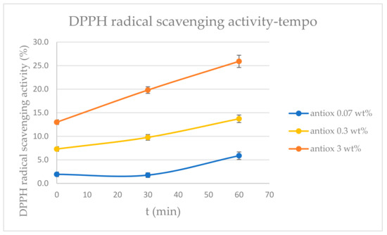 Antioxidant properties of tissues sprayed with polyphenols were evaluated by using the DPPH method. The antioxidant activity was expressed in radical scavenging activity RSA (%) values that were calculated as reported in Equation (1) and represent the capacity of the active molecules to reduce the free-radical activity. From the results shown in Figure 8, a clear antioxidant activity of the active tissues was observed, which significantly grew with the concentration of polyphenols. In addition, it was shown that the lowest concentration of polyphenols needed more than 30 minutes to reveal antioxidant properties, while the other concentrations used showed a significant antioxidant effect in less than 30 minutes.