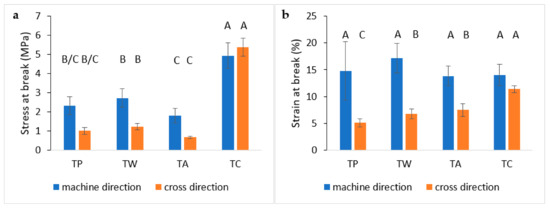 ANOVA of stress at break values (Figure 10a) showed the same grouping in both MD and CD, confirming a significant strengthening effect of chitin with respect to the pure and other coatings. Instead, the statistical analysis of strain at break (Figure 10b) showed some significant differences between MD and CD. The values measured in CD with respect to the same grouping observed in stress at break values showed a predominance of the chitin with respect to the other coating, while, in MD, all the means were not significantly different.