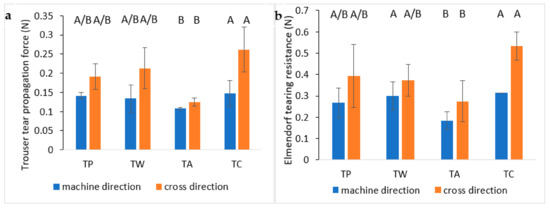 In Figure 11a, the trouser tear propagation force is shown, which can be defined as the force required to propagate the crack. TP and TW samples showed similar values, denoting that, in this case, the application technique did not affect the measured property. Instead, TA and TC showed, respectively, lower and higher values with respect to TP and TW. Regarding the analysis direction in all samples, it was observed that the crack required more force to propagate in CD compared to MD, conversely to the behaviour observed in the tensile test. This behaviour agreed with a partially oriented fibre structure where a tear can easily propagate parallel to the fibres with respect to the perpendicular direction.