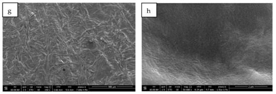 Micrographs of tissues coated with chitin (Figure 12g,h) showed a completely different structure with respect to the one treated with polyphenols. In fact, it was also possible to observe the coating at low magnification (250×) where the chitin completely filled the empty space between the paper fibrils, forming a continue surface. At high magnification, it was not possible to distinguish the fibrillar structure of the paper but only the nanofibrillated structure of chitin covering the treated surface.