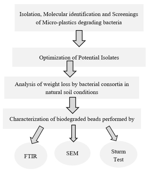 An acclimated consortium capable of degrading polyester, high-density and linear low-density polyethylene pellets was developed in the laboratory. A 500 mL flask with nutrient broth (Sigma Aldrich, Saint Louis, MO, USA) inoculated with Alcaligenes faecalis, Streptococcus sp. and three types of Bacillus spp. was utilized for the degradation experiment. Subsequently, the consortium was cultured, until lag phase was developed, for 6 days. A control was set up containing just broth and beads of LLDPE, HDPE and polyester [26], to examine biodegradation of LLDPE, HDPE and Polyester in off-site conditions. The biodegradation of commercially available plastic beads under the attack of bacteria was studied using the soil burial method for an interval of three months. Pre-weighted beads were washed with 70% ethanol and added to soil. Sterilized pellets were added to soil along with nutrient broth and inoculum. Soil selected was clay loam with pH 8.0. The experiment proceeded from March to May, so temperature variations (23 °C to 45 °C) could be noted.