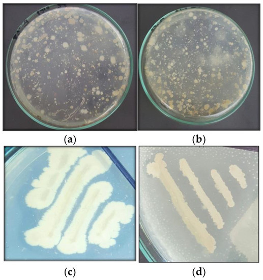 Samples of soil (5 g) were collected from different municipal dumpsites in Multan which are heavily contaminated with various plastic waste, in commercial areas. These specified areas were chosen since they had been used as a plastic dump site for a very long time, expanding the likelihood of finding bacteria that has the ability to degrade plastics. By using a conventional serial dilution method, 50 µL from 10−6 dilution was spread on a nutrient agar (Sigma Aldrich, Saint Louis, MO, USA) plate infused with 1% of plastic powder for the isolation of plastic degrading bacteria, and for each type of given plastic this procedure was repeated. After 15 days of incubation at 37 °C, bacteria with distinct zones were selected and sub-cultured for further characterization [10]. Based on morphological characterization of the bacterial colony after primary screening, Gram-stained slides were observed under light microscope at 40× and 100× for identification.