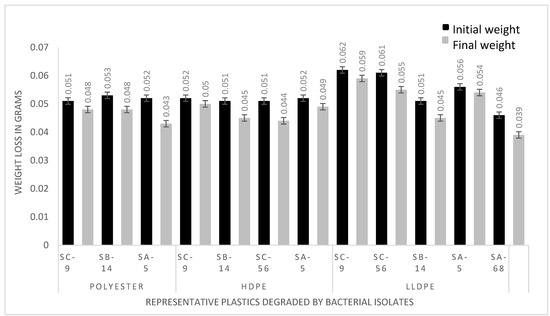 The degradation was determined by calculating the percentage of weight loss in polyethylene and polyester beads by isolated bacteria after 40 days of incubation. Linear low-density polyethylene degraded by SA-5 (Alcaligenes faecalis) (MK517568), SA-68 (Bacillus cereus) (MK517567), Bacillus sp. (SB-14 and SC-9) and Streptococcus spp. (SC-56) by 3.5%, 15%, 11.8%, 4.8% and 9.8%, respectively. High density polyethylene was degraded by SA-5 (Alcaligenes faecalis) (MK517568) Bacillus sp. (SB-14 and SC-9) and Streptococcus spp. (SC-56) by 5.8%, 11.7%, 3.8% and 13.7%, respectively. Polyester was degraded by SA-5 Alcaligenes faecalis (MK517568), Bacillus sp. (SB-14 and SC-9) by 17.3%, 9.4% and 5.8%, respectively. Difference between initial and final weight indicates the significant extent of polyethylene and polyester utilization by the bacteria, as shown in Figure 3. Replicates were used to gain statistical confidence as standard deviation was used, while control (no bacteria) showed zero percentage of degradation, and beads were floating in the media. In the treatment flasks, beads had settled down due to bacterial action.