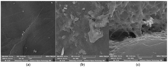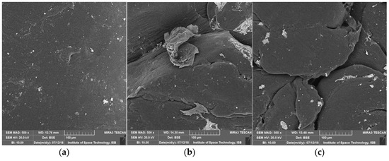 In this study, properties were authenticated with SEM and FTIR analysis. Degradation and morphological changes in polyester, liner-low density and high-density polyethylene pellets after bacterial treatment were analyzed by scanning electron microscopy. As regards the length of all samples, degradation was observed due to the roughness of surfaces and formation of cracks/holes/scions. (Figure 7, Figure 8 and Figure 9). Bacterial cells attached to surfaces were also visualized on some tested pellets. Scanning electron micrographs revealed that isolates cause localized surface deterioration in the plastic pellets, while the outside of untreated plastics is flawless and smooth even following 40 days of incubation. LLDPE samples’ surface indicates bacterial attachment and bacterial actions on surface as shown at 500×, while HDPE and polyester are shown at 1000 and 10,000× for better understanding.