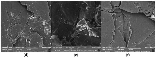 SEM captures of LLDPE beads following 40 days of incubation by isolates. (a) Control, (b) SA-5 Alcaligenes faecalis treated LLDPE showing bacterial attachment, (c) SA-68 Bacillus cereus treated LLDPE showing surface cracks, (d) SB-14 treated LLDPE showing surface erosion, (e) SC-56 treated LLDPE showing granules of bacterial action, (f) SC-9 treated LLDPE showing pith and groove.