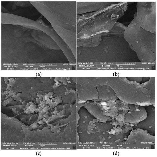 SEM captures of HDPE beads following 40 days of incubation by isolates. (a) Control showing no bacteria present, (b) SA-5 Alcaligenes treated HDPE showing groove, (c) SB-14 treated HDPE showing bacterial granules, (d) SC-56 treated HDPE showing surface cracks and bacterial attachment.