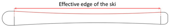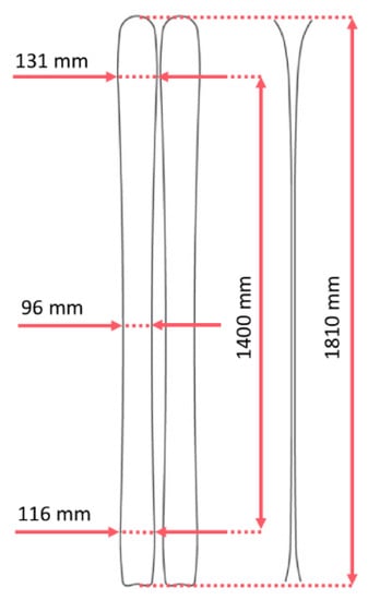 In our case, the spacing of the supports was set to 1400 mm—see Figure 4—i.e., the length of the effective edge of the ski.