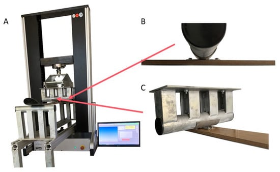 These jigs consisted of a support bed on which different spacing and positioning of the supports could be set (Figure 3A–C). Figure 3A shows the overall arrangement during cyclic bending testing of the manufactured prototype ski. Figure 3B shows the part of the jig that exerts compression on the tested ski. Figure 3C shows the lower part of the pad between the loading mandrel and the tested ski simulating the binding attachment in a practical application.