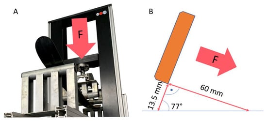 The average skier tilts the ski in a carving arc, most often to 70° to the base. This value was increased by 10% to 77° for our calculations due to the slight over-dimensioning. Based on this angle and the 13.5 mm carving depth of the test sample, the test rig crossbar offset was calculated to be 60 mm using Formula (1):