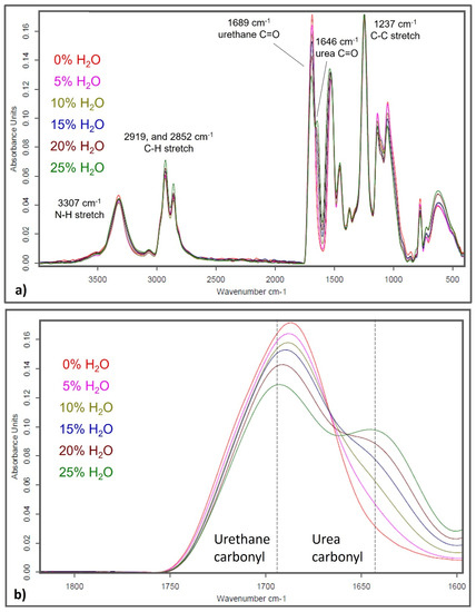 (a) Full absorbance spectra of SMP foams with varying water content. (b) Zoomed in spectra of SMP foams around 1600–1800 wavenumber (cm−1) to show varying urethane and urea peak intensities as influenced by water content.