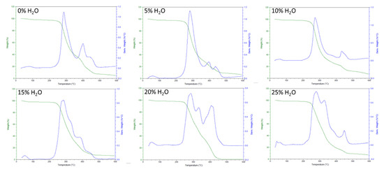 Thermal stability of the SMP foams was determined using thermogravimetric analysis (TGA). Samples (10–15 mg, n = 1) were prepared from the bulk foam. A platinum pan was used to hold each sample and tared before each run. The samples were heated from 30 to 700 °C at 10 °C·min−1 under nitrogen flow of 20 mL·min−1 using a TGA Q 50 (TA Instruments, New Castle, DE, USA). The thermograms were evaluated using TA Universal Analysis software, and percent mass remaining (%) versus temperature (°C) curves for each foam composition were graphed.