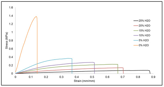 Relative stress (MPa) versus strain (mm/mm), for tensile testing, of SMP foams with varying water content.