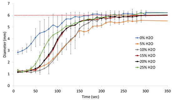 In vitro actuation profiles of SMP foams with varying water content in 37 °C water. The red dotted line indicates the original foam cylinder diameter of 6 mm.