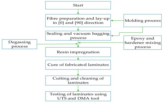 Laminates were cut using a computer numerical control (CNC) machine within a tolerance of 0.02 mm to prepare them for testing. A total of 116 laminates were prepared for the three-point bending and DMA tests. Before the test, the laminates were cleaned and flashes were removed using sandpaper. The laminate preparation and testing process using RTM is shown in Figure 1.
