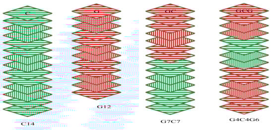 The comparison of the loss modulus results obtained on C, G, GC, and GCG laminates as a function of temperature and frequency is shown in Figure 6 and Table 7. In particular, it is clear from Figure 6 that the maximum loss modulus in all groups of laminates was observed at the Tg of the epoxy matrix. This occurred due to an increase in internal friction that enhanced the mobility of the epoxy matrix to dissipate heat []. The increase in the storage modulus values and Tg of all groups of laminates at increasing frequency occurred due to temperature-dependent molecular relaxation behaviour in polymers, i.e., molecular relaxation takes place at higher temperatures. The amount of dissipation energy on the four laminates can be assessed from the loss modulus results presented in Table 7. The lowest energy dissipation performance was identified in the hybrid GC laminates at 1 Hz. In the case of 100 Hz, pure glass and carbon laminates had the lowest and highest energy dissipation performance, respectively. However, hybridisation of the two materials was used to obtain the optimal energy dissipation performance at higher frequencies.