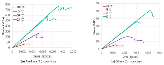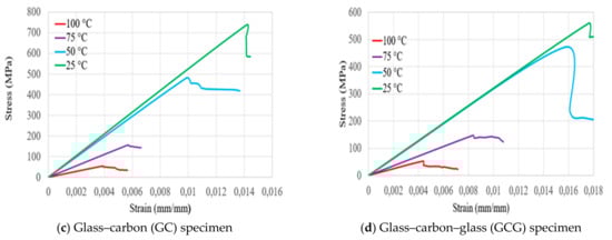 Figure 3 presents the flexural stress and strain relationships of bidirectional composite samples of carbon, glass, glass–carbon, and glass–carbon–glass laminates as a function of increasing temperature. It shows that the flexural strength of tested carbon (C), glass (G), glass–carbon (GC), and glass–carbon–glass (GCG) bidirectional composite laminates decreased as the testing temperatures increased. As Figure 4 indicates, linear deformations in all laminates were observed until they approached their maximum flexural stress. Once the laminates reached their maximum flexural strength, failure and a sudden drop in properties occurred. The average test results on the flexural strength (Fs) and modulus (E) properties at different testing temperatures for the bidirectional C, G, GC, and GCG laminates are summarised in Table 3, Table 4, Table 5 and Table 6, respectively. Since the modulus of glass fibres is much lower than that of carbon fibres, both flexural strength and modulus decreased with increasing thickness of the glass fibre in the laminates. In the case of hybrid GC laminates, the thickness of the glass fibre was 51.54% of the total thickness of the laminates. When 51.54% glass fibre was applied on the outer upper surface of the laminates, the flexural strength and modulus decreased significantly when compared to carbon laminates. This occurred due to the presence of compressive and tensile stresses at the outer and bottom surfaces of the laminate.