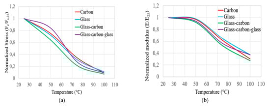 In addition, those tables contain the ratios of flexural strength (Fs/Fs,25) and flexural modulus (E/E25) of all of the targeted tested laminates. Furthermore, the values of the coefficient of variation of all laminates were calculated from the tested specimens. The ranges of the coefficient of variation (CV) of the measured flexural strength of the tested C, G, GC, and GCG laminates were 3.09–7.37%, 2.58–7.87%, 1.8–5.33%, and 2.23–8.13%, respectively, at the targeted temperatures. However, the CV ranges of the measured flexural modulus of the tested C, G, GC, and GCG laminates were 0.85–7.35%, 3.77–7.62%, 3.91–7.80%, and 2.13–4.63%, respectively. The larger values of CV were observed in calculating the flexural strength and modulus of the hybrid GCG and GC laminates. In all groups of laminates, the value of CV was less than 10%, which is a statistically acceptable result.