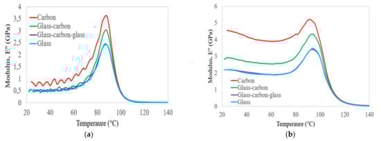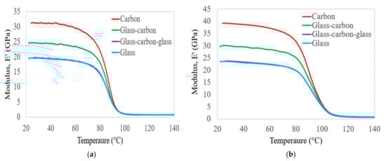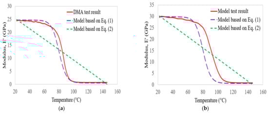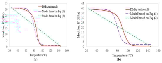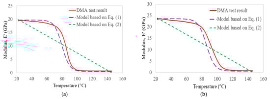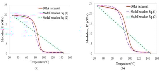 In this section, the storage modulus results obtained from DMA tests on C, G, GC, and GC laminates are compared with empirical models []. According to Gibson et al. [], the temperature-dependent behaviour of FRP composite materials can be determined based on the following equation: