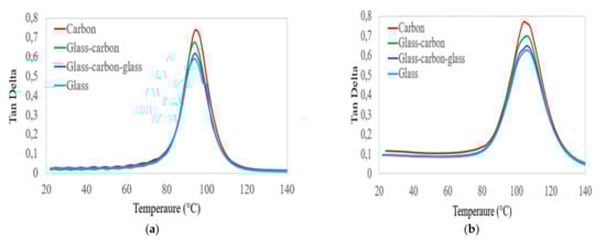 Figure 5 shows the comparison of the storage modulus results obtained at a frequency of 1 Hz and 100 Hz for the C, G, GC, and GCG laminates as a function of increasing temperature. It is clear from Figure 5 that the storage modulus results of all groups of laminates were increased from their initial values as the frequency changed from 1 Hz to 100 Hz. Those variations in storage modulus occurred below the glass transition temperature of the polymer matrix. However, the storage modulus of all groups of laminates was the same below the decomposition state within all of the targeted testing frequencies. This happened due to damage to the fibre–epoxy resin interface.