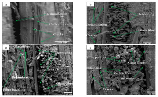 The failure modes of the hybrid composite laminates were assessed using SEM, and are shown in Figure 8c,d. It can be seen from Figure 8c that fibre buckling and delamination failure modes were observed on the glass–carbon laminates near the top layers, with the arrangement of the fibres at [0]s. Voids and debonding between the fibre and the matrix were observed between [0]s and [90]s fibre configurations. Figure 8d shows the failure properties of the glass–carbon–glass laminates obtained from the SEM results. It can be seen that scattered cracks and delamination failure modes were observed in the [0]s fibre configuration. In particular, the failure modes were changed to fibre pull-out and debonding when the fibre configurations were changed to [90]s. Based on the observation of the SEM results, scattered cracks and delamination failure modes occurred on the fibre configuration at [0]s. Fibre pull-out and debonding failure modes occurred in the case of [90]s fibre configurations. This may have been due to the difference in the flow rate of the epoxy resin in [0]s and [90]s fibres.